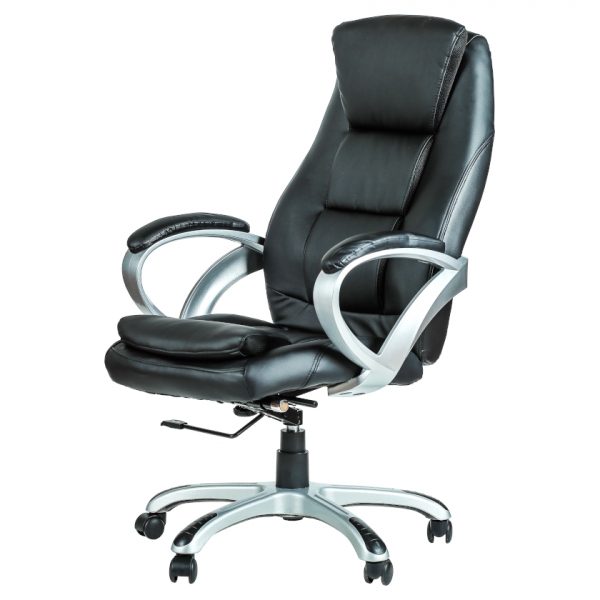 Udoben črn pisarniški stol iz PU usnja in poliamidnih vlaken z oblazinjenimi nasloni, nastavljivo višino in nagibom. Stabilna baza s 5 koleščki, Class 3 plinska vzmet. Nosilnost 130 kg, teža 19 kg – odlična izbira za dolgotrajno delo v pisarni.